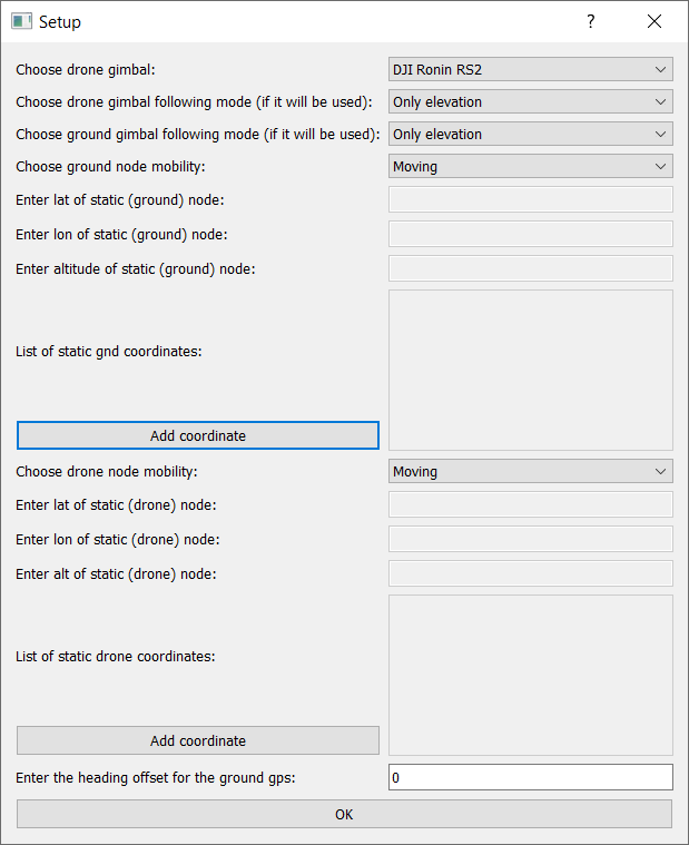 Static, the following text boxes will become active. Enter there the coordinates (in decimal degrees) of the drone's node and after that pressAdd coordinate: