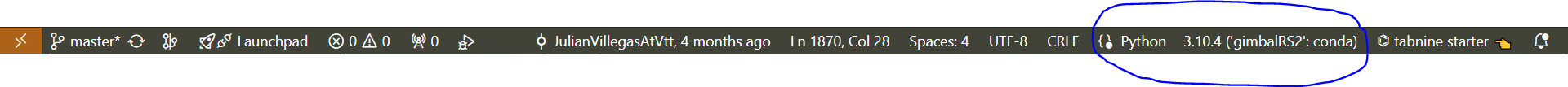 - By default it has been setup to use the correct python environment, but (if needed) to set it up, press the highlighted section of the bottom bar: