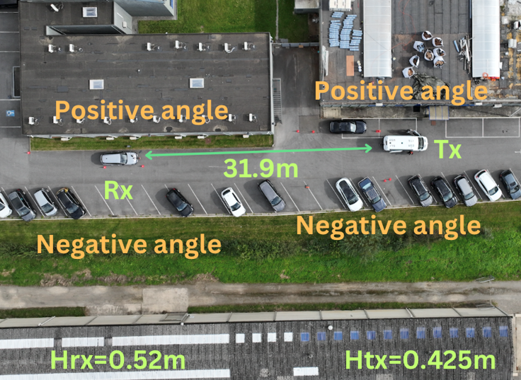 Scenario with multiple reflectors (cars, windows, walls) and transceivers separated by more than 30 m